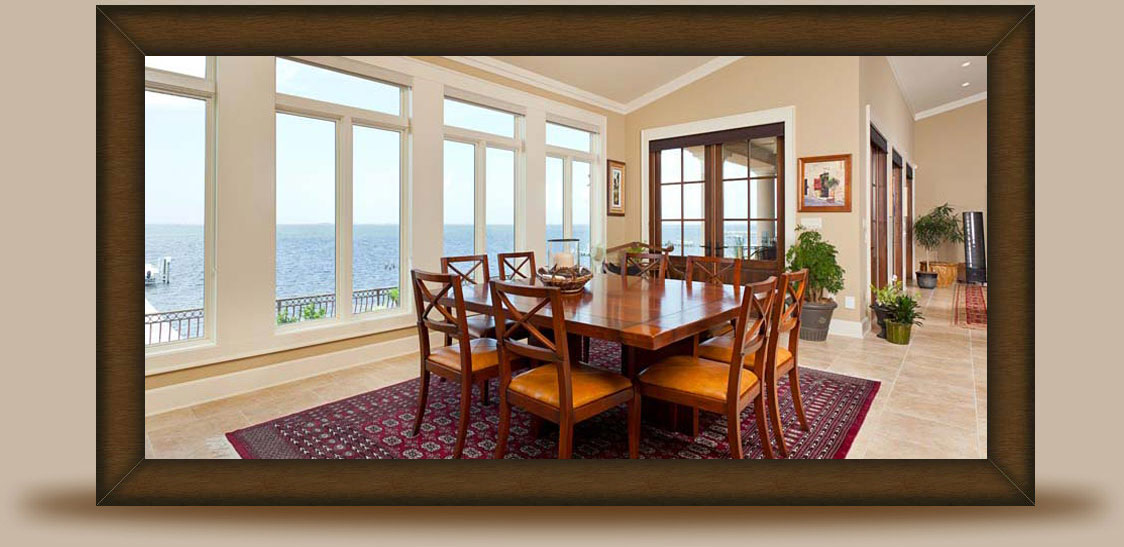 Also located on the water, the Modern Mediterranean is constructed on pre-stressed concrete pilings for increased stability. The exterior facade is an attractive hard-coat stucco, applied over concrete board. All exterior decking and stairways were constructed from South American ironwood – one of the hardest woods available. An open interior consists of ceramic tile flooring and warm mahogany cabinetry that encompasses a commercial kitchen for gourmet cooking and casual entertaining.